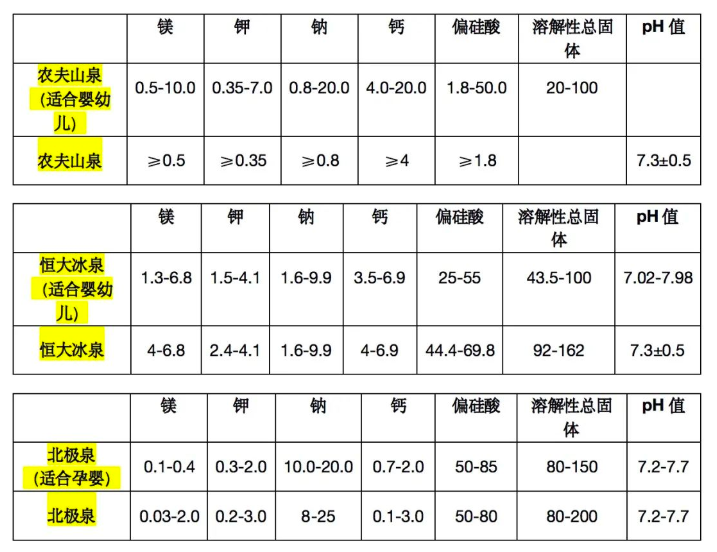 结果发现,两者的成分含量并没有显著的区别。如农夫山泉(适合婴幼儿)标注镁含量为0.5-10.0,钾含量为0.35—7.0,钠含量为0.8—20.0,钙含量为4.0—20.0,偏硅酸为1.8—50.0;而农夫山泉普通饮用水标注镁含量为≥0.5,钾含量为≥0.35,钠含量为≥0.8,钙含量为≥4,偏硅酸为≥1.8。