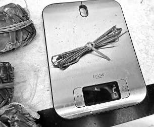 记者对螃蟹捆扎绳称重。 施本允/摄
