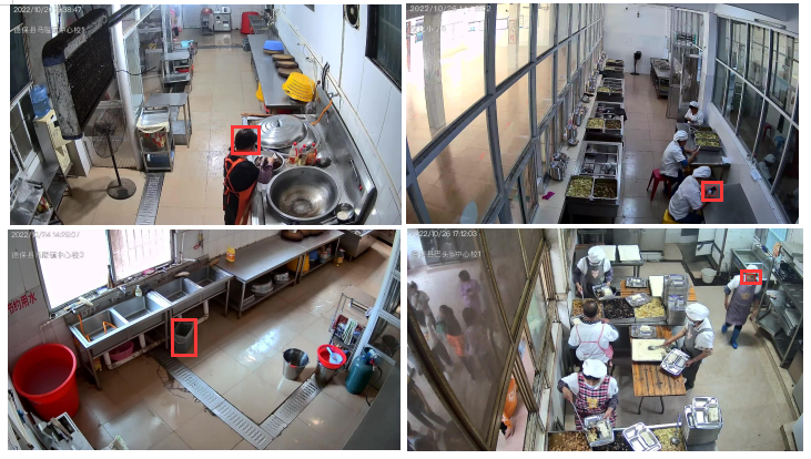 百色市食品安全智能服务平台系统要求,学校食堂分别在后厨的切配区、烹饪区、洗消区安装云摄像头,通过互联网接入平台,重点对学校食堂后厨加工的常见违规行为,如有害生物、未戴帽子、未戴口罩、吸烟、玩手机、未盖垃圾桶盖等,运用AI智能可视化自动抓拍,并将整改通知及时发送至辖区监管人员和学校食品安全责任人手机上,督促其及时整改,确保了食材加工全视角的过程可控。