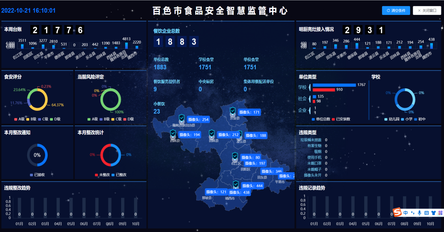 2022年6月,百色市人民政府印发《百色市学校食堂“互联网+明厨亮灶”建设工作方案》,百色市建设了食品安全智能服务平台,并于2022年7月正式启用。现已完成全市学校食堂以及集体配餐单位“互联网+明厨亮灶”100%全覆盖建设。