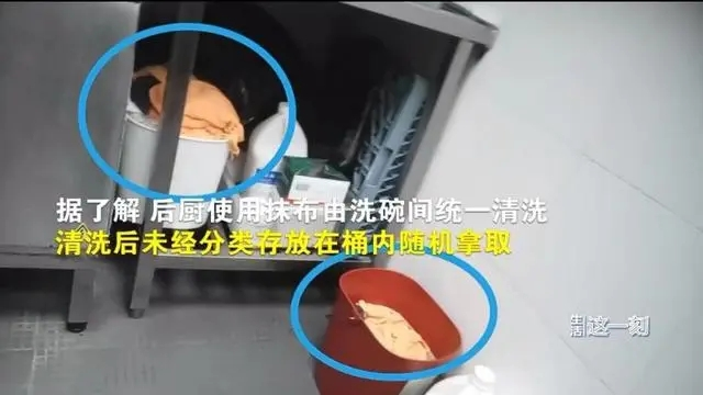 另外,店内后厨使用的抹布由洗碗间统一清洗,清洗后未经分类存放在桶内随机拿取。一种橙色的抹布可以用来擦道具、擦垃圾桶、擦食物架、擦碗……什么都能擦。