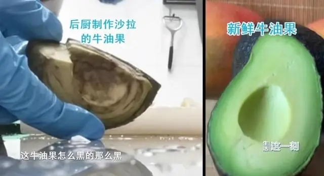 曝光视频中可以看到,今年2月初,卧底记者进入涉事门店后厨冷荤间负责沙拉甜品制作,记者观察到制作沙拉使用的部分水果并不新鲜。画面中出现切开的牛油果已经发黑,操作者直接去掉黑色部分继续使用的情况。