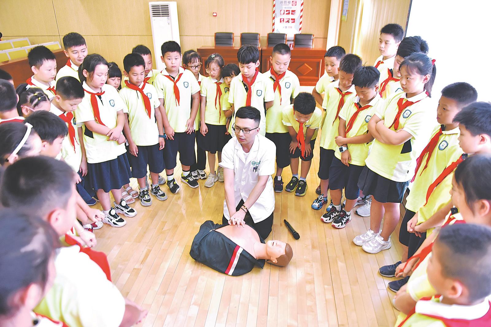 9月9日是2023年“世界急救日”。9月6日,合肥市振兴小学开展“应急救护进校园”活动,邀请合肥市蜀山区健康巡讲专家现场向师生传授应急救护技能和自动体外除颤器的使用技巧等,普及急救知识。 通讯员 葛宜年 摄