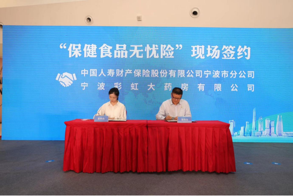 在食责险“宁波模式”提质专场,发布“保健食品无忧险”,这也是该保险的全国首发。宁波彩虹大药房有限公司与宁波市食品安全责任保险共保体承保人中国人寿财产保险股份有限公司宁波市分公司签订首份投保协议。