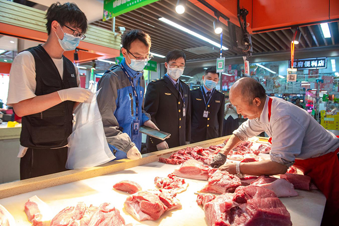 爱府路农贸市场现场抽取猪肉封装。明光市市场监督管理局供图
