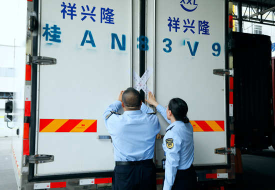市场监管部门驻点监管人员对准备发往学青会运动员村的食品专用运输车辆张贴封条。何正君摄