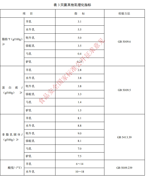 此次修订还调整了理化指标和微生物限量要求,如巴氏杀菌牛乳的酸度下限调整为10oT;巴氏杀菌羊乳的酸度上限调整为14oT;增加了水牛乳、牦牛乳、骆驼乳、驴乳和马乳的脂肪、蛋白质、非脂乳固体、酸度等理化指标的要求,如在蛋白质含量(g/100g)方面,指标与常温奶要求一致。