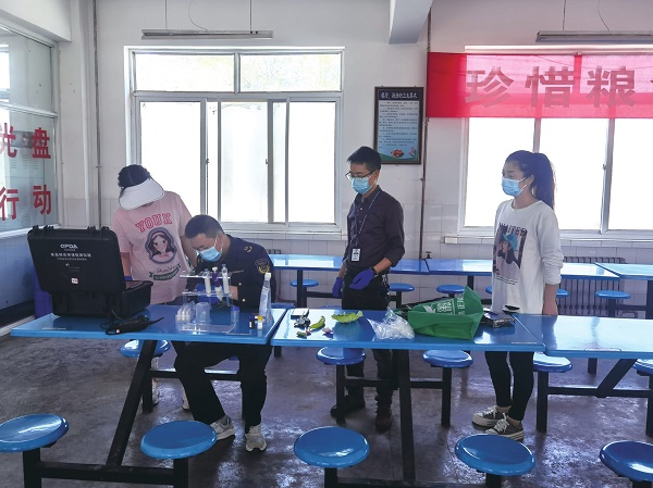 图为华亭市策底镇市场监管部门执法人员在辖区一所学校餐厅对抽样的食材进行现场快检。于红霞 史安良 文/摄