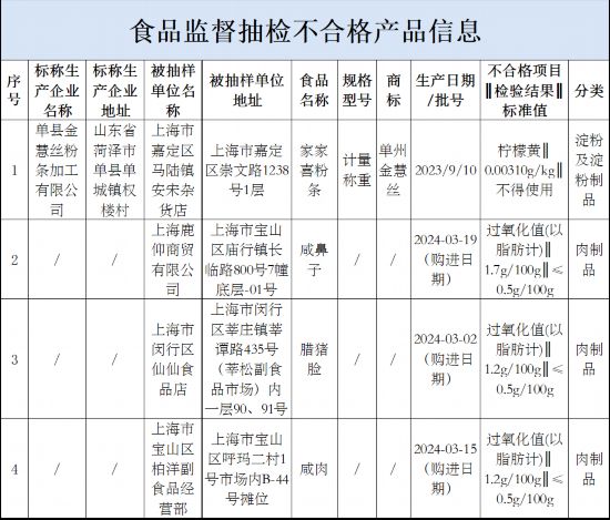 对上述抽检中发现的不合格产品,上海市市场监管局已要求相关区市场监督管理局及时对不合格食品及其生产经营者进行调查处理,依法查处违法行为,进一步督促经营者履行法定义务,并将相关情况记入食品生产经营者食品安全信用档案。查处情况由经营者所在地负责案件查办的区市场监督管理局按规定公开。