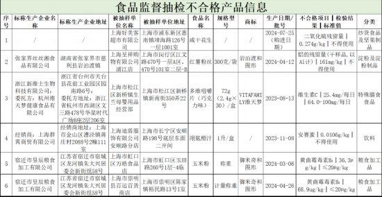 上海市市场监管局介绍,上海市市场监督管理局2024年第35期省级食品安全抽检信息涉及8大类食品,包括:炒货食品及坚果制品、淀粉及淀粉制品、罐头、粮食加工品、食品添加剂、速冻食品、饮料和特殊膳食食品。抽检样品共计1351批次,其中合格1345批次、不合格6批次。详见↓