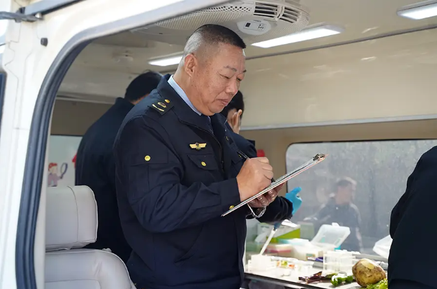 一旁的食品安全快速检测车也备受关注,不少居民提着刚买的蔬菜前来检测,现场气氛热烈。