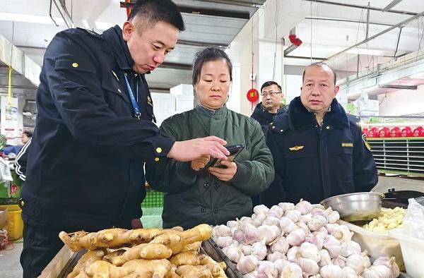 图为联合执法人员针对本地风险突出的重点农产品生姜进行重点检查。本报记者 乔燕强 摄