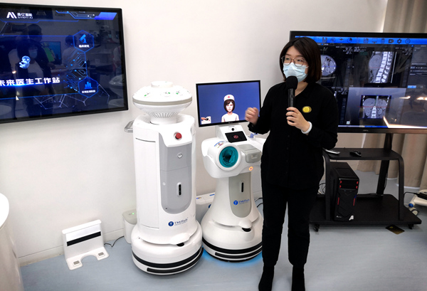 图为工作人员为记者介绍曾经用在新冠肺炎疫情防控一线的智能消杀机器人。人民网记者 孙博洋摄