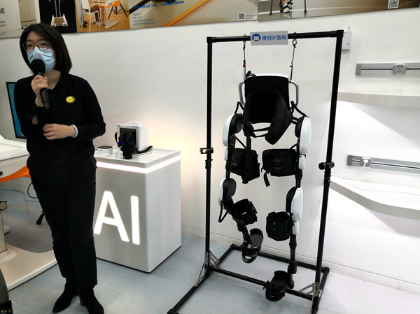 张江人工智能岛AI体验中心工作人员为记者讲解人工智能在医疗方面的应用,图为下肢外骨骼康复机器人。人民网记者 孙博洋摄