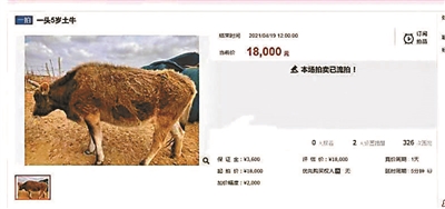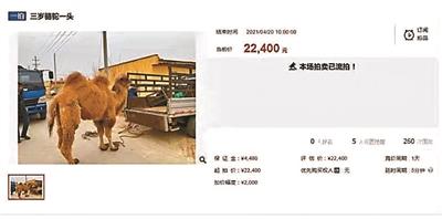 今年4月19日12时,新疆维吾尔自治区木垒哈萨克自治县人民法院在阿里拍卖平台上对一头3岁的骆驼和一头5岁的土牛进行拍卖。骆驼的起拍价格为22400元,土牛的起拍价格为18000元。截至2021年4月20日12时,两只活物标的物最终流拍。