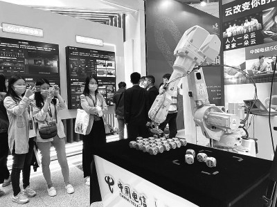 5月17日,2021年世界电信和信息社会日大会上,人们正在围观一款5G工业机器人。本报记者 刘坤摄/光明图片