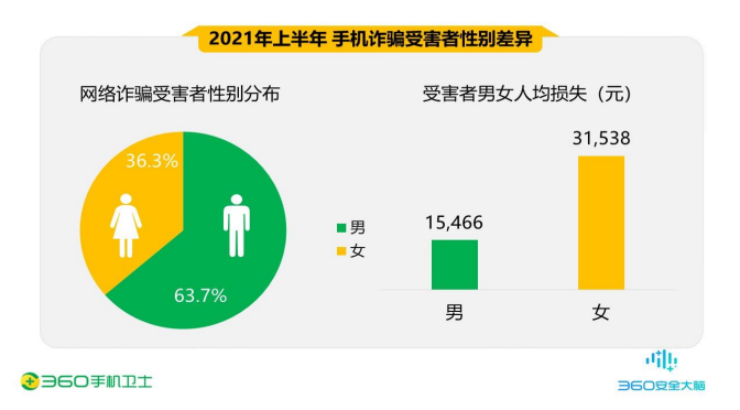 根据《报告》,从举报用户的性别差异来看,今年上半年360手机先赔接到的诈骗举报男性受害者占63.7%,女性受害者占36.3%,男性比例明显高于女性。而从人均损失来看,男性受害者的人均损失低于女性。其中,男性为15466元,女性为31538元。