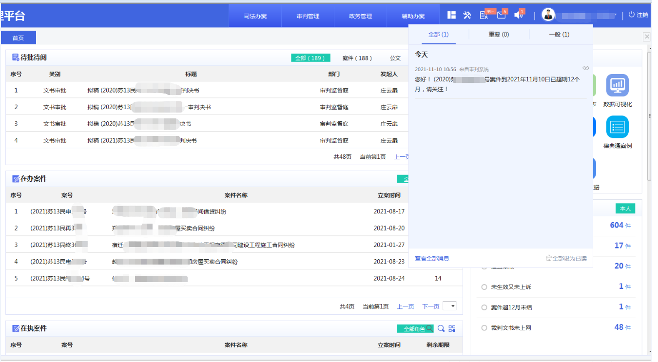 研发案件流程节点管控系统。针对速裁案件,对达到一定时限节点的案件提前预警提示和控制,涵盖立案、审理等流程环节,实现节点监控、事项提醒、案件和节点信息汇总统计与反查、部门预警、监督情况统计、案件锁定统计等功能,协助法官、院庭长把握案件办理情况,实现科学化、精细化管理,提升案件办理质效。在各个节点设置预警时间,节点届满前提前向承办人和院庭长预警,便于及时处置。在各个节点届满时,通过主动推动信息、自动锁定等方式,实现监督管理。开发可视化界面,集中展示节点监测信息。