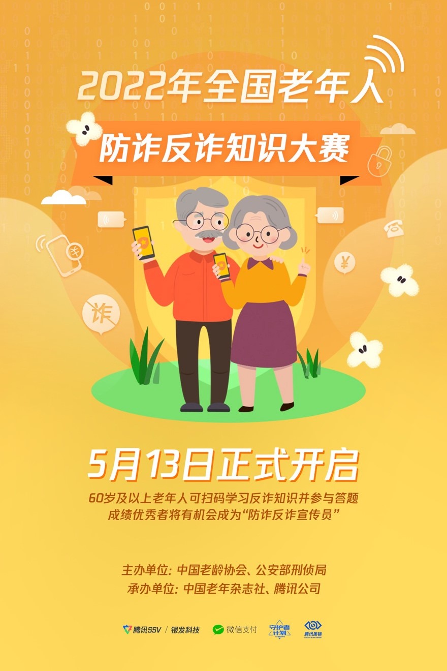 为提升老年群体防骗识骗能力,守护老年人的“钱袋子”, 5月13日,由中国老龄协会、公安部刑侦局主办,中国老年杂志社、腾讯公司承办的 “2022年全国老年人防诈反诈知识大赛”正式启动。作为“全民反诈在行动”集中宣传月的一项重要活动,大赛通过线上线下反诈知识科普、反诈知识竞答等多种方式为老年人普及反诈知识。