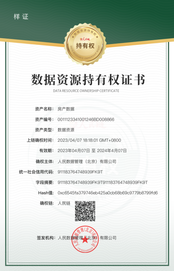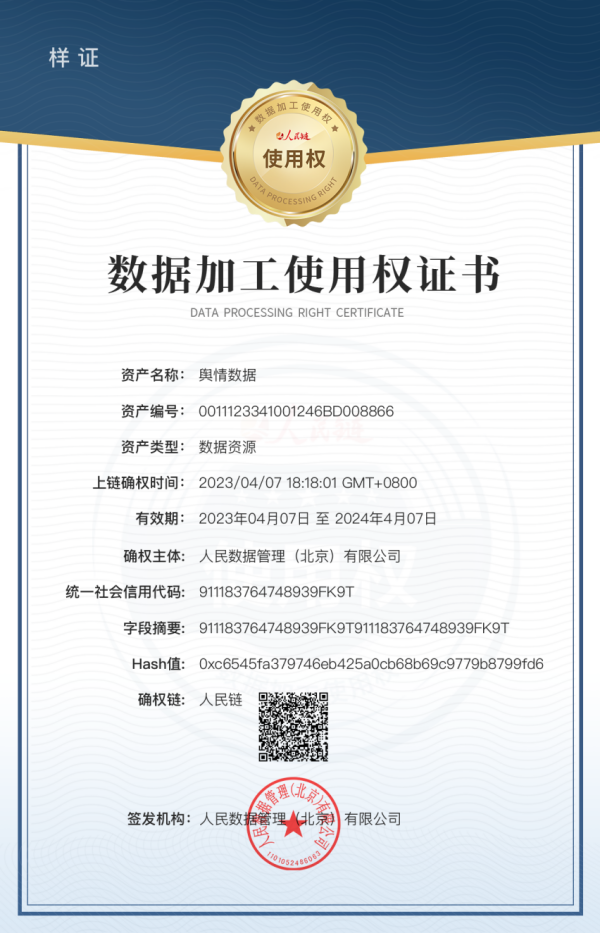 7月11日,由人民网·人民数据管理(北京)有限公司针对数据要素市场打造的“数据资源持有权证书”“数据加工使用权证书”“数据产品经营权证书”(三证)正式面向全国发放。