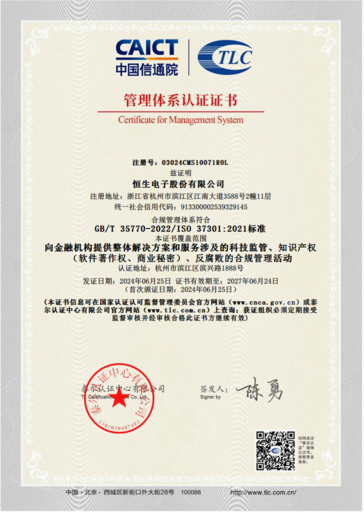 恒生电子股份有限公司的主要业务是向金融机构提供整体解决方案和服务,此次认证范围覆盖了主要业务涉及的科技监管、软件著作权、商业秘密、反腐败的合规管理活动。ISO 37301是国际通用的合规管理体系认证标准,规定了组织建立、运行、保持和改进合规管理体系的要求,获得该认证,表明恒生公司具备了该标准所要求的合规管理水平及能力。