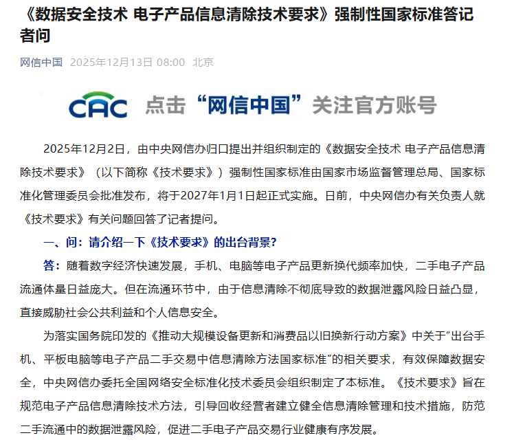 2025年12月2日,由中央网信办归口提出并组织制定的《数据安全技术 电子产品信息清除技术要求》(以下简称《技术要求》)强制性国家标准由国家市场监督管理总局、国家标准化管理委员会批准发布,将于2027年1月1日起正式实施。日前,中央网信办有关负责人就《技术要求》有关问题回答了记者提问。