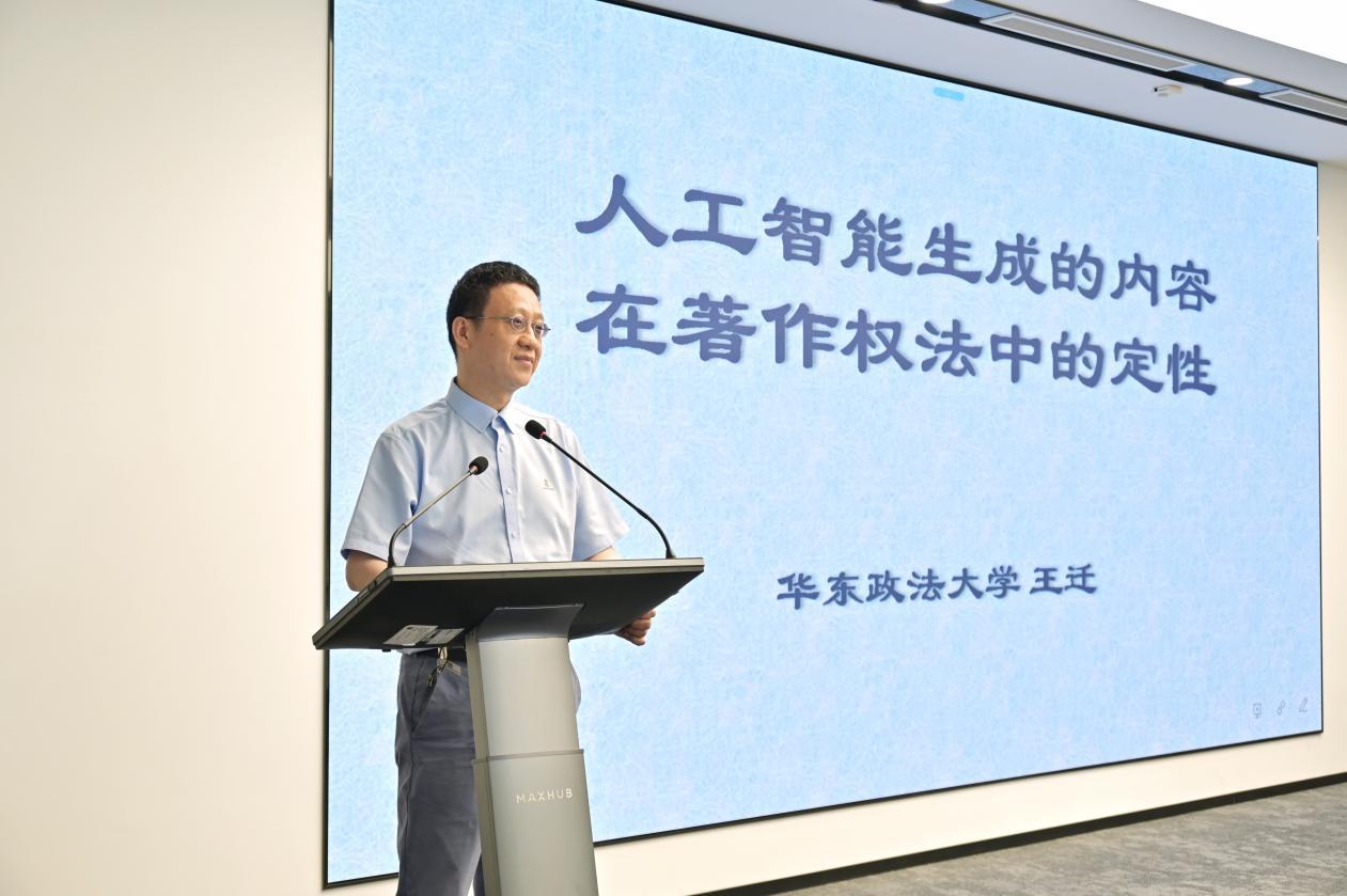 在四个小时的课程讲解中,王迁教授就其观点系统梳理了人工智能技术在内容生成、数据处理等领域带来的著作权法新挑战。他围绕AI生成内容的可版权性认定、权利归属、训练数据使用的合法性边界、AI“创作”对传统著作权制度的冲击与调适等核心议题,进行了鞭辟入里的分析。不仅阐释了现行法律框架下的理论难点,更结合国内外最新立法动态、司法判例及产业实践,提出了富有洞见的思考方向与可能的解决路径。