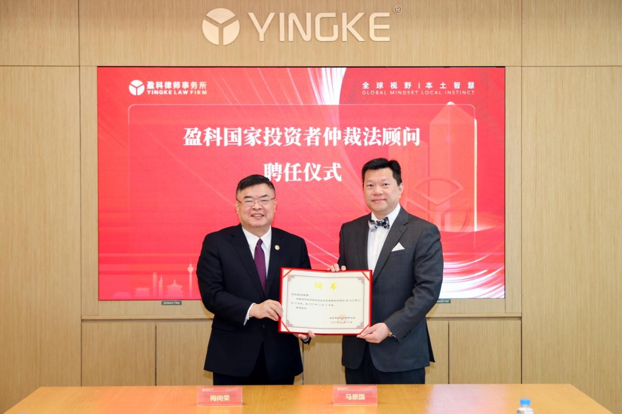 梅向荣为马恩国颁发聘书,正式聘任其为盈科国家投资者仲裁法顾问。