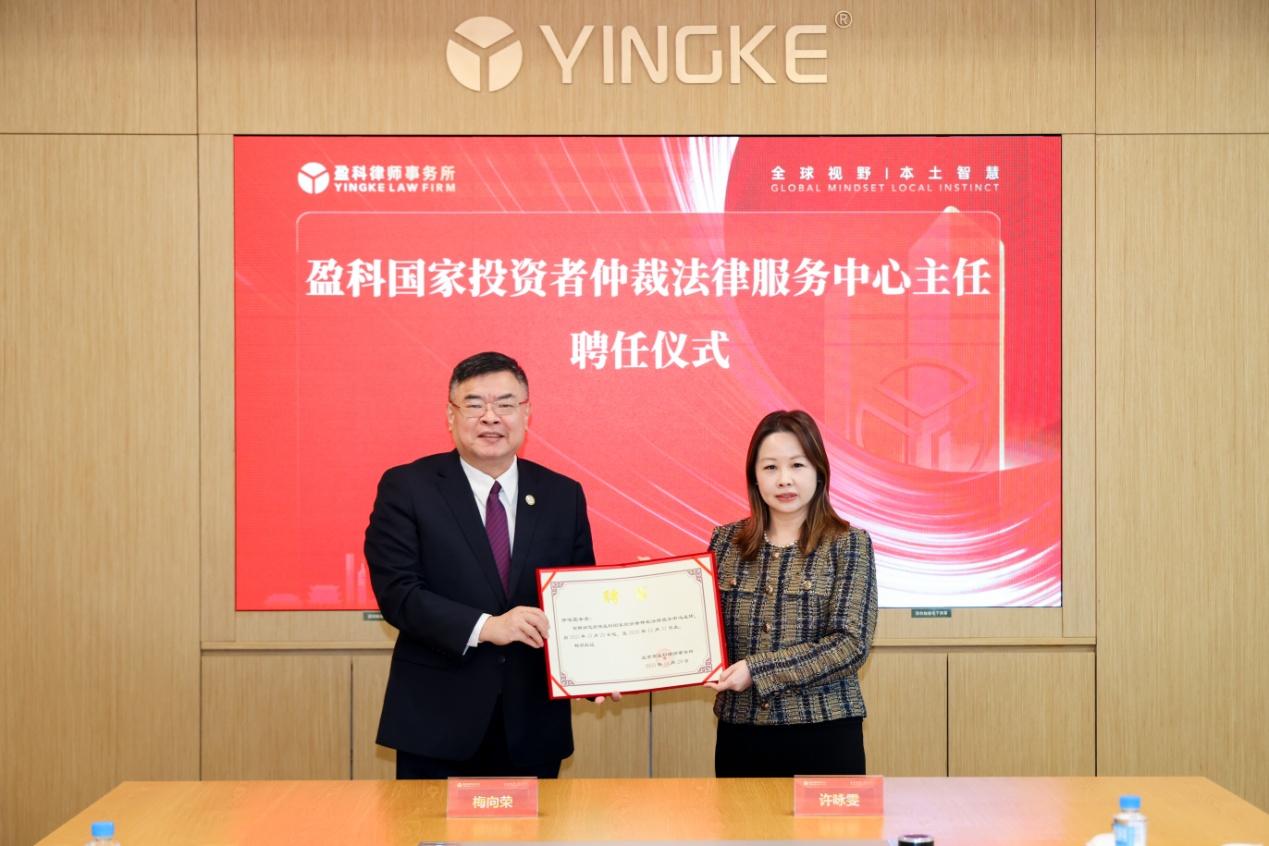 梅向荣为许咏雯颁发聘书,正式聘任其为盈科国家投资者仲裁法律服务中心主任。