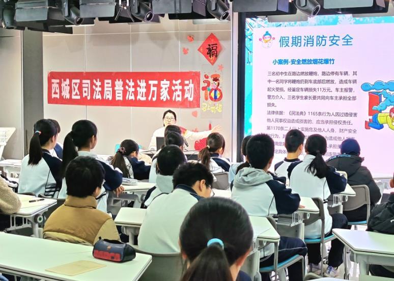 1月23日,北京市西城区司法局晨夕普法团队联合区学生综合实践活动中心、北京市第十三中学,举办“寒假来临 安全先行”安全教育普法讲座。图为律师在现场与同学们积极互动。
