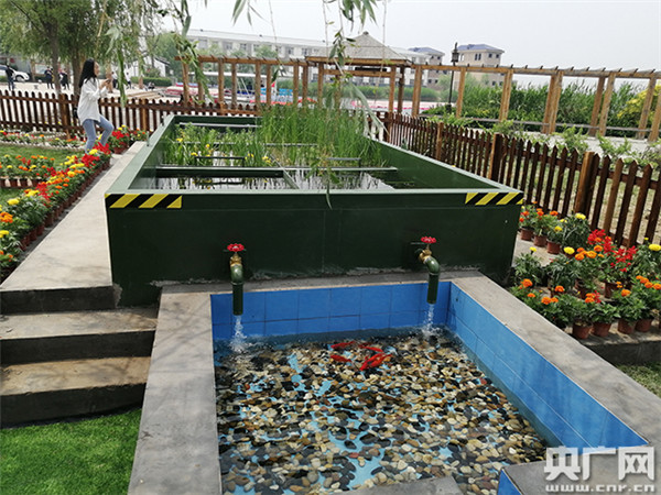 经过净化过滤后,水流进入末端的生态净化系统,利用当地普遍的水生植物,比如千屈菜、水葱、绿苇、菖蒲等,进一步吸附残余的污染物。“我们还在末端设置了储水池,放了几条锦鲤。一个是为了更好的景观效果,再一个也是测试水质是否合格,因为锦鲤对水质的要求还是很高的。”张特说。