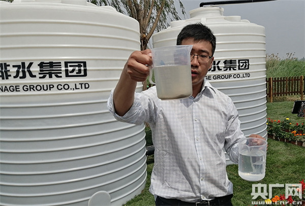 图为污水处理前后对比,处理后水质明显改善。(央广记者 佟亚涛 摄)