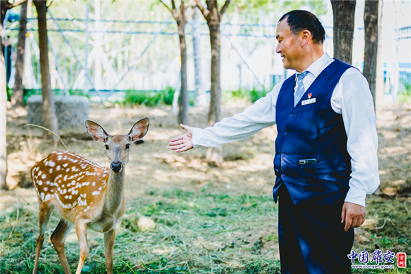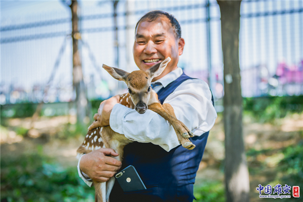 6月23日下午1点48分,雄安新区的梅花鹿“雄雄、安安”顺利生下鹿宝宝。图为雄安市民服务中心园区环境管理部主任李国元抱着鹿宝宝。中国雄安官网记者马梦迪 摄