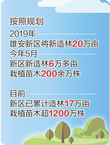 中国雄安集团生态公司相关负责人表示,先植绿、后建城,是雄安新区建设的一个新理念。按照规划,2019年雄安新区将新造林20万亩。今年5月,新区完成2019年春季造林任务,新造林6万多亩,栽植苗木200余万株。目前,新区已累计造林17万亩,栽植苗木超1200万株,今年20万亩造林项目正在实施。