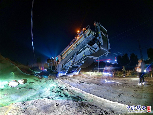 9月26日凌晨3时,在技术人员的遥控下,两套移动式破碎筛分机缓慢进入雄县整体拆迁村关李马浒村和佐各庄村。中国雄安官网记者马梦迪 摄