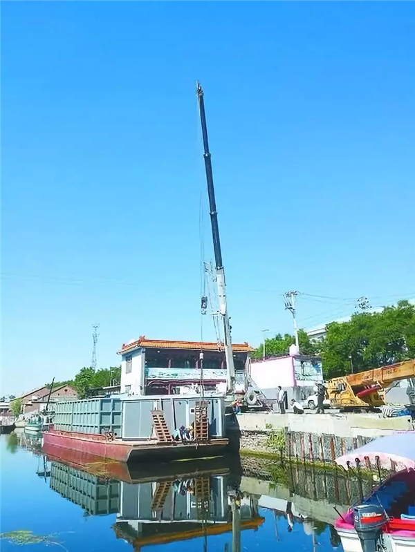 第一次在水中村施工,作业困难特别多。刘岳华告诉记者,因为是水中村,所以村里施工的一砖一瓦都是靠船运过去的,为了吊装大型设备,大吊车甚至需要在水中乘船作业。“我们也是头一次在水中村施工,很多问题都是第一次碰到,只能打破作业习惯,见招拆招了。”刘岳华说,在赵庄子村,一体化污水处理站设置在村边,可是村边临水,陆地上根本没有大型吊车的作业空间。施工人员绞尽脑汁,最后想到了水路,于是找来两艘载重30吨的大船,搭起一个水上施工平台,一艘用来放设备,一艘用来进行焊接等施工作业。