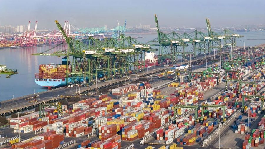 2月2日拍摄的天津港太平洋国际集装箱码头(无人机照片)。新华社记者赵子硕 摄