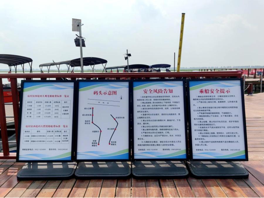 统一服务、标准化流程。每艘船出发前,船工都会用扩音器播放安全提示。乘船安全提示、安全风险告知等展牌整齐地摆放在出入口。志愿者会在码头为游客提供服务。