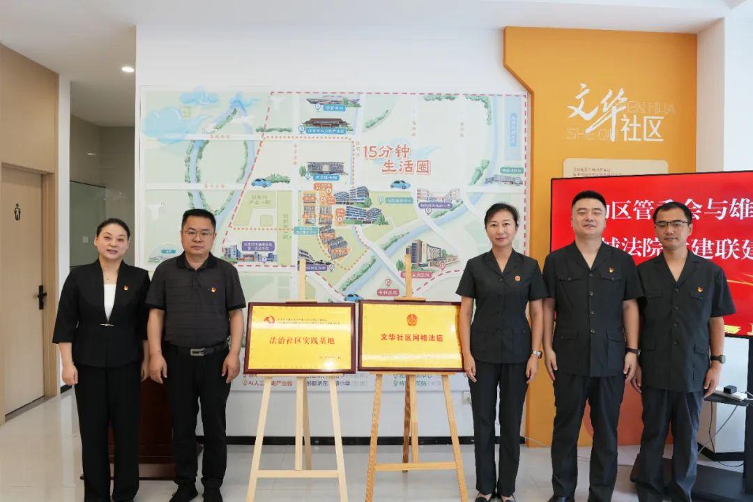 为促推基层治理法治化水平“上台阶”,8月19日,河北雄安新区中级人民法院、容城县人民法院与雄安新区启动区管理委员会在文华社区开展党建联建活动。雄安新区社会工作部副部长张春雷,雄安中院党组副书记、副院长李静静共同为“法治社区实践基地”和“文华社区网格法庭”揭牌。启动区管委会党组成员、副主任黄媛媛,容城法院党组成员、副院长郭凯以及党员干警、社区群众代表30余人参加活动。