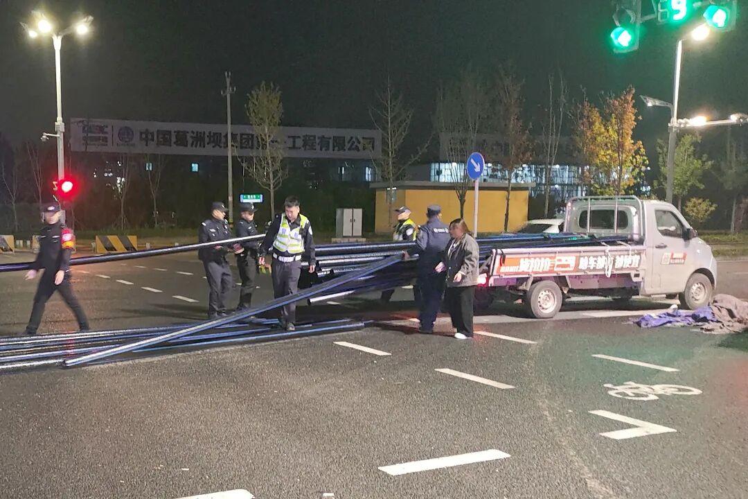 吉海祥带领执勤队员迅速行动,一组在来车方向摆放警示标识,引导车辆缓慢绕行;一组帮助搬抬金属管材,合力将其逐一装回车上。经过近20分钟的紧张忙碌,所有散落管材均被重新装载上车。