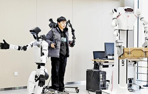 近日,在中国雄安集团数字城市科技有限公司的具身智能训练场内,数据采集员正对异构机器人进行具身智能训练。记者刘光昱 摄