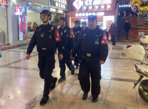华灯初上,贵州省贵阳市南明区青云市集人头攒动。位于市集大门口的警务站警灯闪烁,一队队“藏蓝身影”来回穿梭,守护着城市的烟火气。