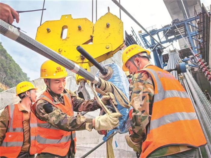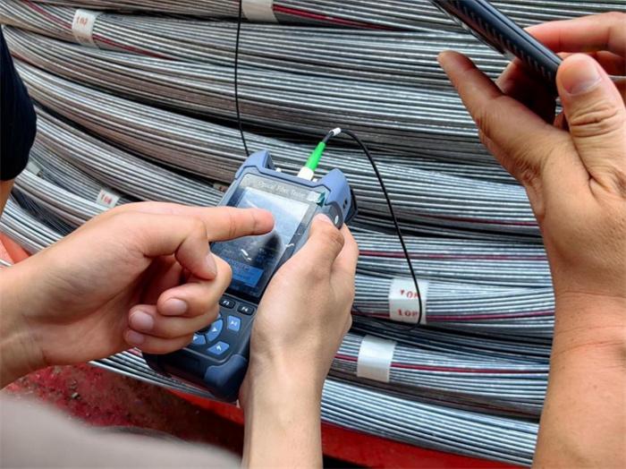 由于智慧缆索光纤成分是二氧化硅,安装过程精度要求高,施工过程中,六安8标现场管理人员和工人聚精会神、精准调度,严格控制牵引速度,排查各工序对光栅光纤的保护措施。6日16时许,智慧缆索成功拉通入鞍后顺利通过功能检测。