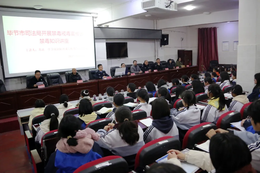 近日,贵州省毕节强制隔离戒毒所(以下称毕节所)携手毕节市司法局、威宁县司法局及毕节所驻威宁县专地融合工作站一起走进威宁县第九中学开展以“青春无‘毒’,绿色守护”为主题禁毒宣传活动。