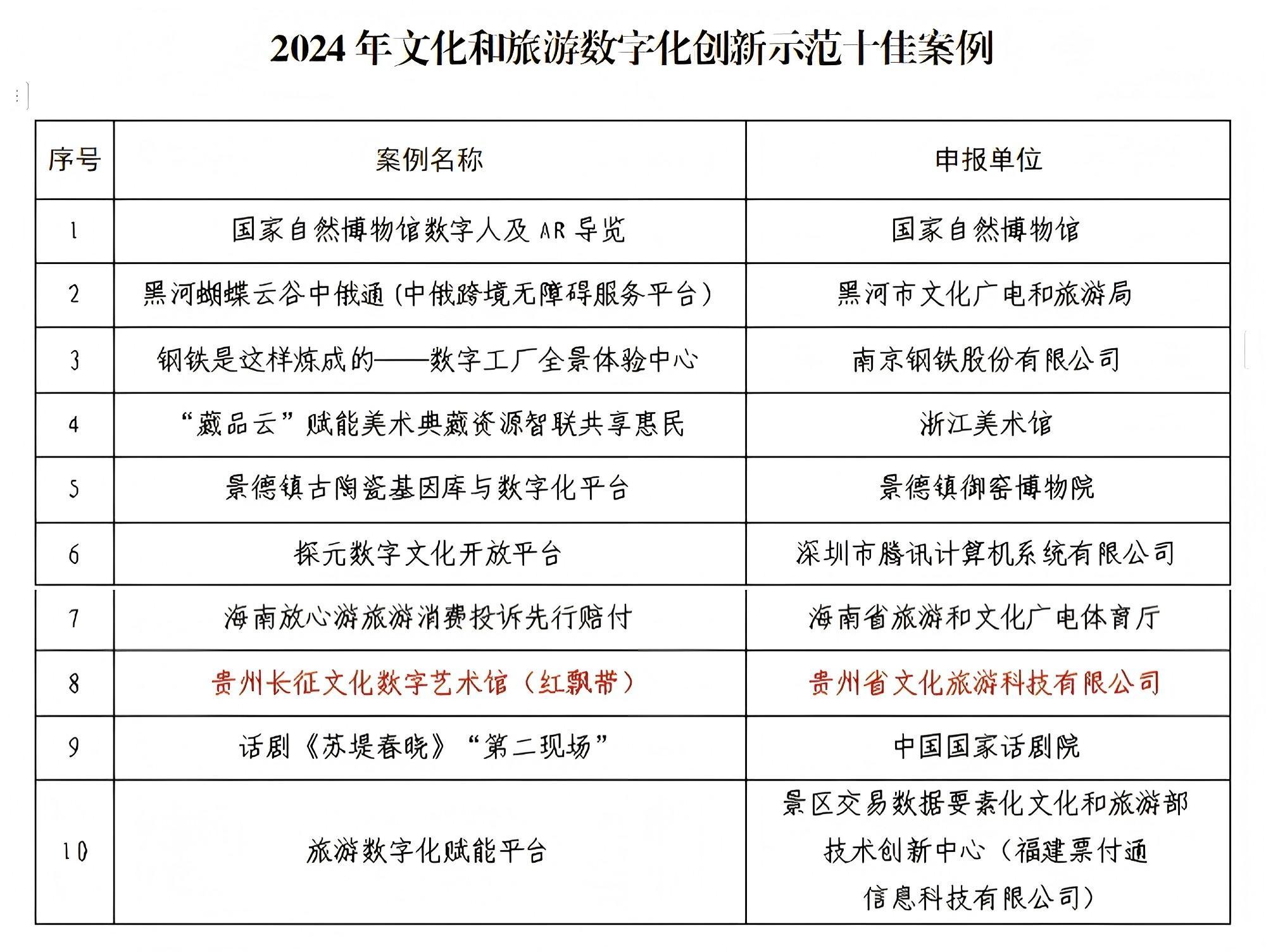 近日,文化和旅游部公布了2024年文化和旅游数字化创新示范十佳案例,集中示范推广文化和旅游领域数字化创新的最新成果。“贵州长征文化数字艺术馆(红飘带)”入选2024年文化和旅游数字化创新示范十佳案例。