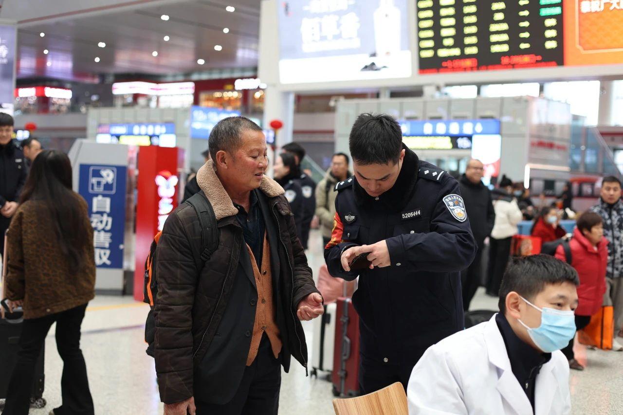 “注意脚下,请往这边走。”“您好,您的检票口在前面右转。”“我来帮您提行李吧!”在贵阳北站候车室内,戴着红袖套的志愿者民警们为旅客提供咨询指引、搬运行李、电子取票等温馨服务,用这一抹红色点缀春运,用实际行动温暖寒冬。