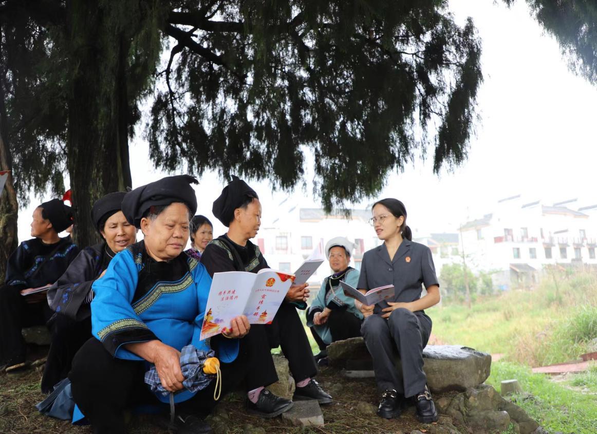 作为一名水族法官,蒙胜翠还结合本地水族群众讲传统、重习俗,蒙胜翠就借助“水书先生”“绣娘”的智慧与经验,将水家文化习俗与现代法治精神相融合,通过开展“水语法庭”“布依语法庭”巡回审判,联合“水书先生”等乡贤参与矛盾纠纷调处,成立“绣娘调解室”、组建“水乡巾帼调解队伍”等,开展多方联动,实现情理法融合,促进矛盾纠纷实质化解。