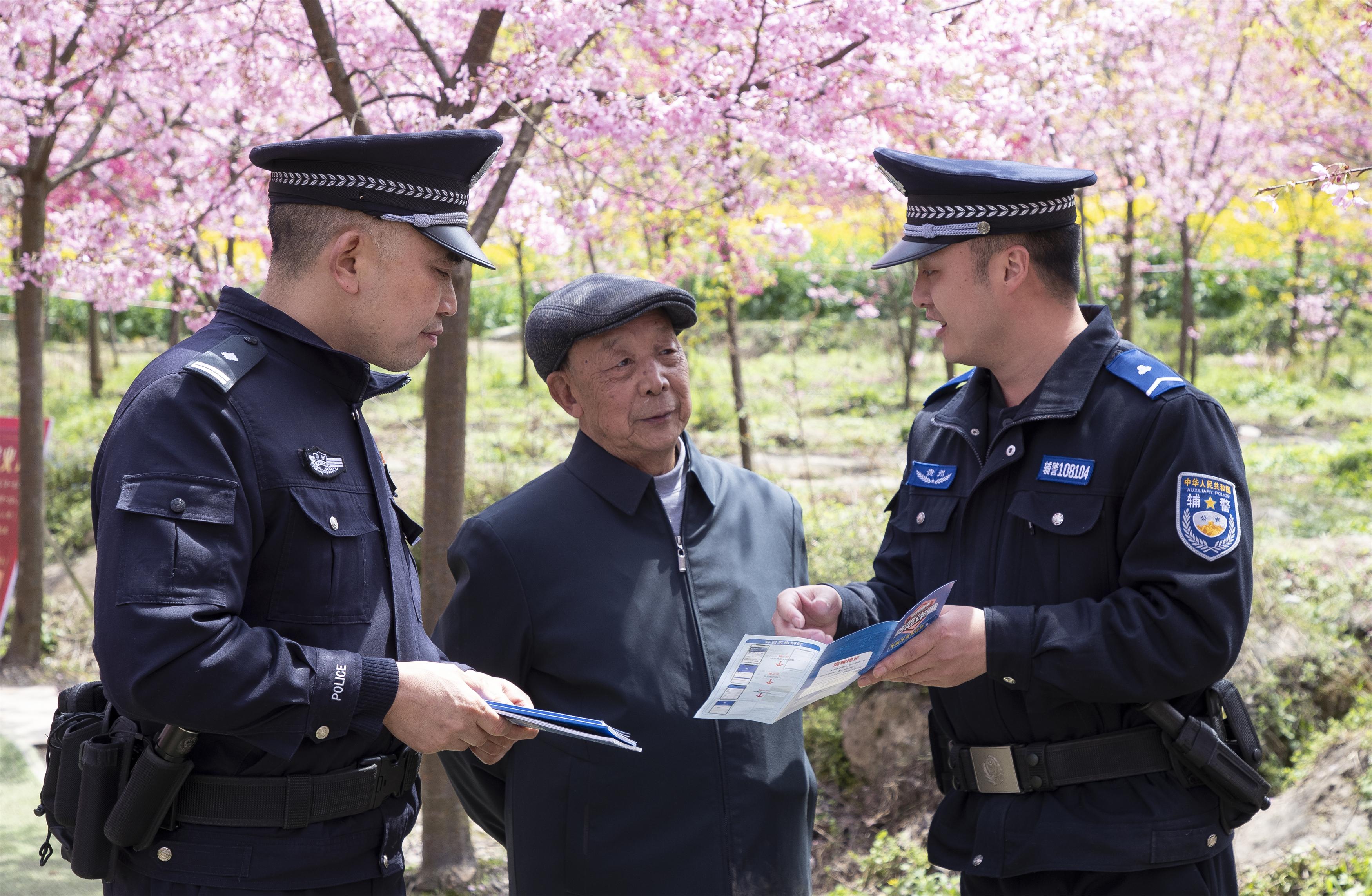 樱花树下,民警积极主动,发放资料、讲解案例、解答疑问,与前来赏花的游客“唠安全、讲反诈、话平安”,让大家在赏花游玩的同时增强了自身安全防范意识。