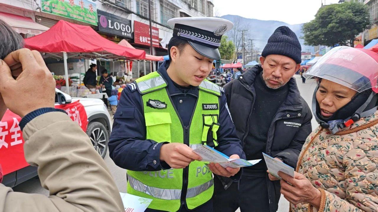 在农村赶集日,宣传民警来到集市中心,设置宣传点,摆放交通安全宣传展板,并向群众发放宣传手册。与此同时,为助力群众合法合规上路行驶,民辅警还现场详细讲解摩托车上牌办证的规范流程,引导群众主动遵守交通法规。