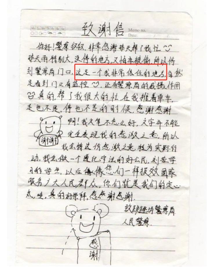 感谢信中,女孩用真挚而稚嫩的语言表达了对派出所民辅警的感激之情“这是一个我非常信任的地方。”稚嫩的笔迹让全所民辅警动容,信中附着的手绘插画,虽然简单却充满了童真和感激。